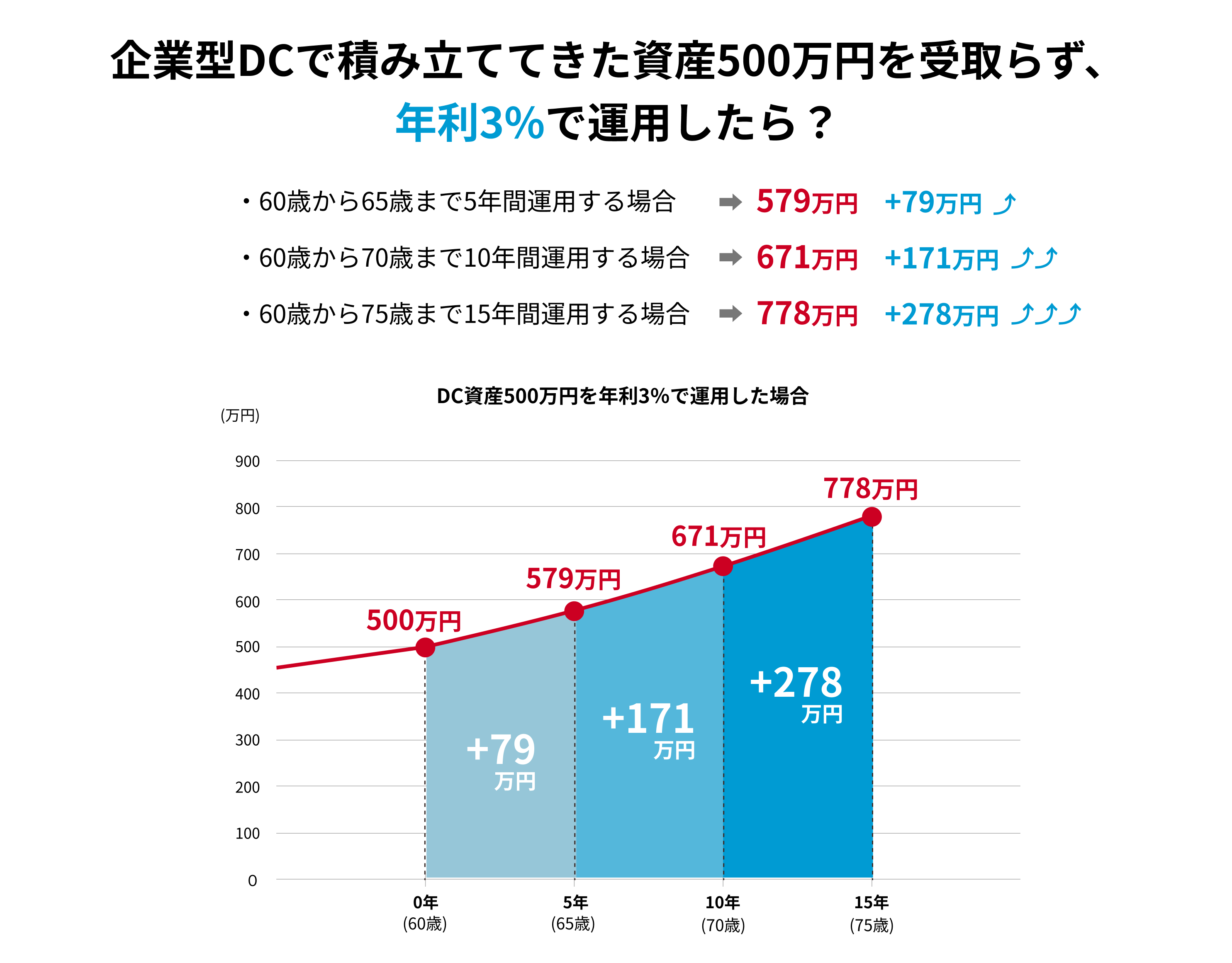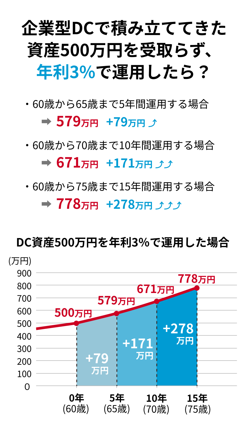 すぐに受け取る必要がない場合はこれまで企業型DCで積み立ててきた資産を「運用益非課税」で、継続して運用することが可能です。